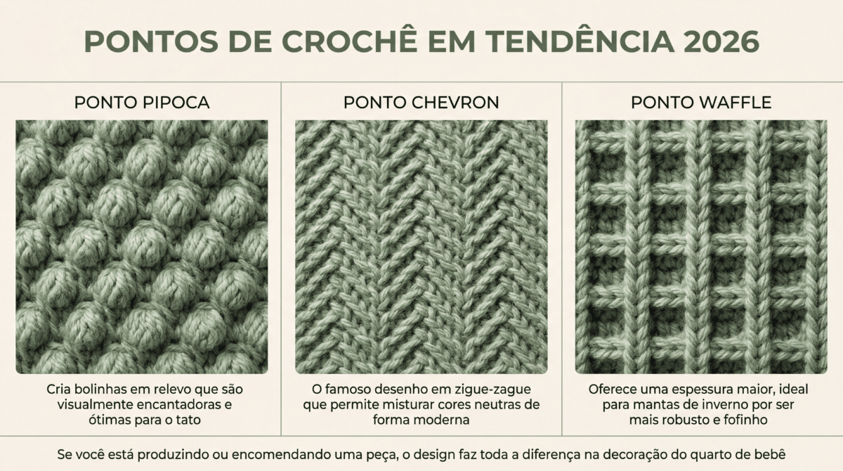 Especialistas em enxoval de maternidade afirmam que a textura do crochê oferece um estímulo sensorial importante para o recém-nascido. No entanto, para garantir a segurança do bebê, é fundamental saber escolher o material correto e o tipo de ponto, evitando alergias ou desconfortos.