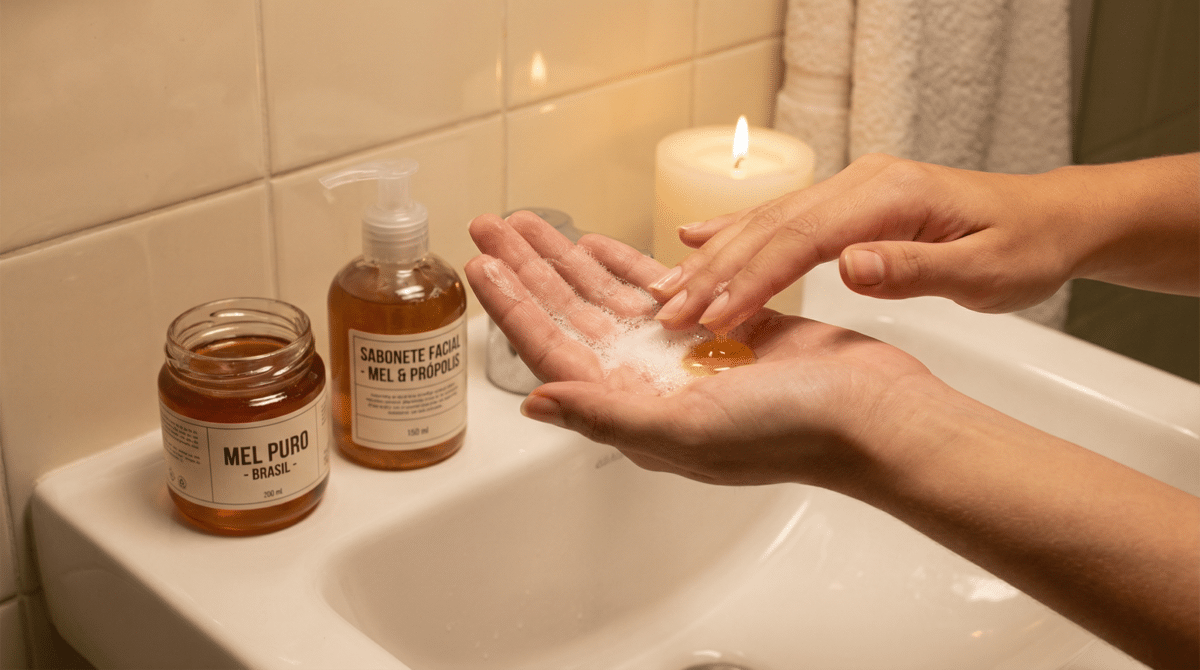 Para quem sofre com vermelhidão ou sensibilidade, o mel atua como um bálsamo. Ele contém compostos fenólicos e flavonoides que acalmam processos inflamatórios e aceleram a regeneração celular. Quando combinado com o sabonete facial, ele neutraliza o efeito ressecante que alguns agentes de limpeza (surfactantes) podem causar, deixando a barreira de proteção da pele intacta.
