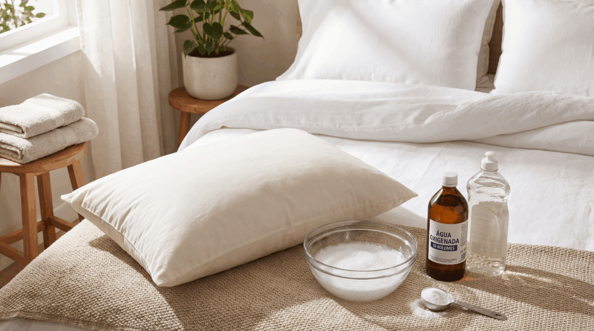 A primeira reação costuma ser esconder o problema com fronhas novas ou pensar em comprar travesseiros novos. Só que, se o enchimento ainda está firme e confortável, você pode recuperar o branco original com uma boa higienização, em vez de gastar trocando tudo. A chave está em usar um método caseiro. Essa mistura ajuda a remover manchas de suor, gordura e odores sem recorrer ao cloro ou produtos muito agressivos.