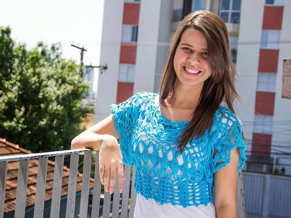 Olha eu novamente com a mini blusa em crochê de grampo só que essa ficou um pouco maior e aumentei as carreiras do acabamento, como tive sobra de quase um novelo do fio que fiz a anterior resolvi misturar com esse com brilho e achei que ficou bem legal !!!