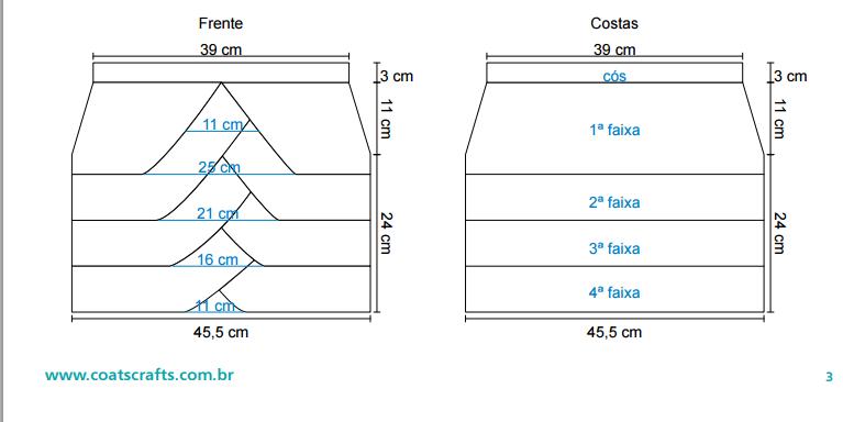 • Ag. para crochê de aço niquelado Corrente Milward de 1,75 mm. • Chatons cromados prateados medindo 1,5 x 1,5 cm. Abreviaturas e pontos utilizados: ag. – agulha; arrem. – arrematar; carr. – carreira; corr. – correntinha; p.bx. – ponto baixíssimo; p.b. – ponto baixo; p.a. – ponto alto; pipoca – 3 p.a. laçando a mesma base e fechados juntos; trab. – trabalhe. Faixas – acompanhar a tabela de sequência de carreiras e cores. Cós – acompanhar o respectivo diagrama. Execução Do papel, faça um molde para a frente e um molde para as costas. Todo o trabalho é feito usando fio duplo na mesma cor.