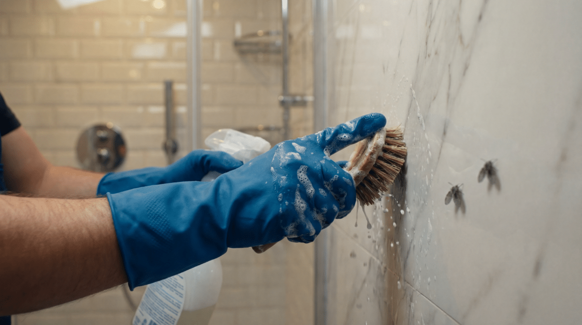 Se o seu banheiro está cheio dessas moscas cinzas, não é bom sinal, pois elas carregam microrganismos das tubulações para as superfícies onde você realiza sua higiene pessoal. A presença delas indica que existe uma camada de biofilme (aquela “baba” escura) dentro dos ralos, que serve como berçário para suas larvas. Se elas estão voando pelo cômodo, significa que o ciclo de reprodução já está estabelecido. Para combater o problema, siga estes passos: