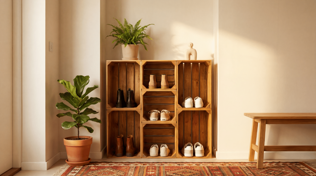 O hall de entrada é o cartão de visitas de qualquer residência, mas frequentemente se torna um ponto de desorganização com sapatos espalhados. A tendência do “upcycling” — transformar objetos descartados em peças de valor — apresenta os caixotes de feira como a solução ideal. Além de sustentáveis, essas peças oferecem um visual rústico-moderno que se adapta a diversos estilos de decoração, desde o industrial até o escandinavo.