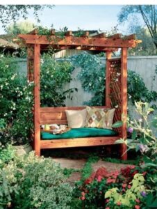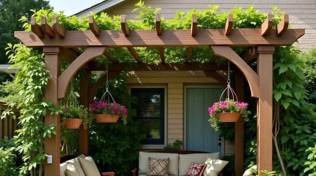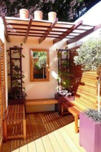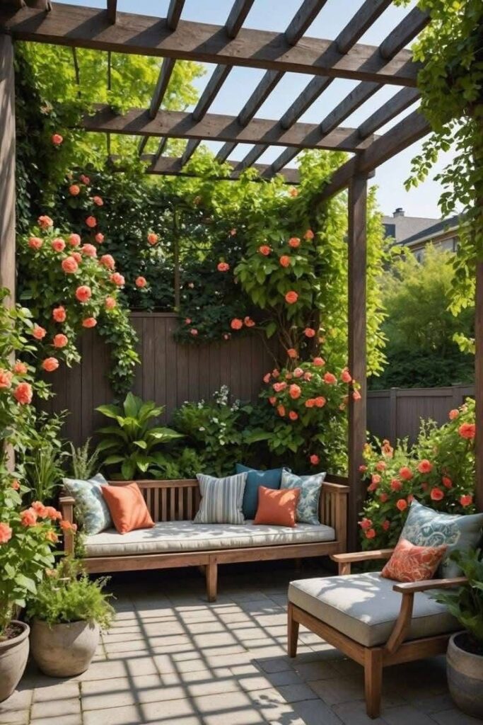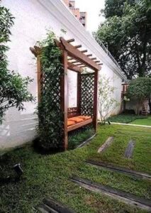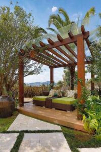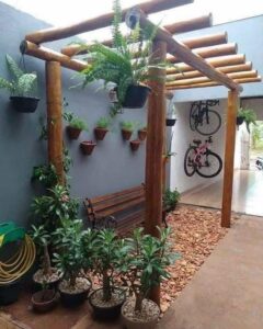 - Suporte para plantas: Trepadeiras e flores dão um charme natural e refrescante, integrando o pergolado à paisagem do jardim.