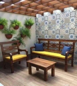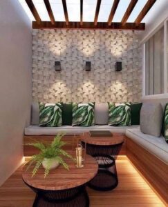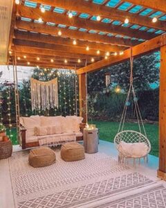 - Móveis confortáveis e funcionais, como sofás externos e mesas de apoio.