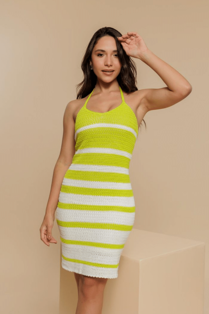 31ª carr.: 182 pts. (amarelo neon); 32ª à 34ª carr.: 182 pts. (branco); 35ª à 41ª carr.: 180 pts. (amarelo neon); 42ª à 45ª carr.: 180 pts. (branco); 46ª à 51ª carr.: 180 pts. (amarelo neon); 52ª à 56ª carr.: 180 pts. (branco); 57ª à 60ª carr.: 180 pts. (amarelo neon); 61ª carr.: 198 pts. (amarelo neon); 62ª à 68ª carr.: 198 pts. (branco); 69ª à 72ª carr.: 198 pts. (amarelo neon); 73ª à 81ª carr.: 198 pts. (branco); 82ª à 85ª carr.: 198 pts. (amarelo neon); 86ª à 95ª carr.: 198 pts. (branco); 96ª à 98ª carr.: 198 pts. (amarelo neon); 99ª à 104ª carr.: 198 pts. (branco); 105ª à 109ª carr.: 218 pts. (branco); 110ª e 111ª carr.: 218 pts. (amarelo neon); 112ª à 117ª carr.: 218 pts. (branco). Finalize a barra com o bico de acabamento acomp. o diag. 3 e o p. de rep. (118ª carr. fio branco). Alças.: Use a ag. de crochê de 2,5 mm e o fio Verano na cor amarelo neon, unir o fio na parte superior de cada bojo e trab. a alça acomp. o diag. 4 e o p. de rep. da 119ª à 159ª carr.. Essas alças serão amarradas ao redor do pescoço. Bico de acabamento: Use a ag. de crochê de 2,5 mm e o fio Verano na cor amarelo neon, trab. ao redor do decote parte das costas, bojos e sobre as alças 1 carr. de p.b.. Rem. o fio. Forro e zíper: Forro modelado sobre os bojos e ao corpo. Prenda o forro na peça contornando os bojos e no decote parte das costas em pts. de alinhavo. Use a ag. para costura nº 2 e a linha Maxxi retrós na cor amarelo candy.