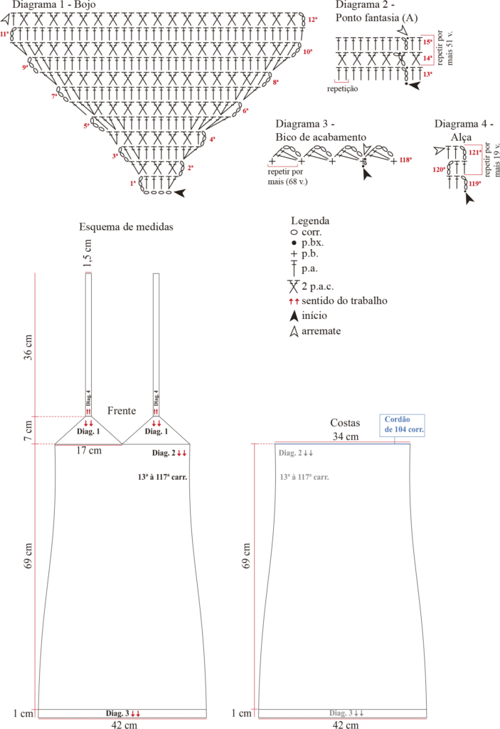 Abreviaturas: acomp.: acompanhando, ag.: agulha, carr.: carreira, diag.: diagrama, dir.: direito, esq.: esquerdo, p.: ponto, pts.: pontos, rep.: repetição ou repetições, rem.: rematar, seg.: seguinte, trab.: trabalhe ou trabalhando, v.: vezes.