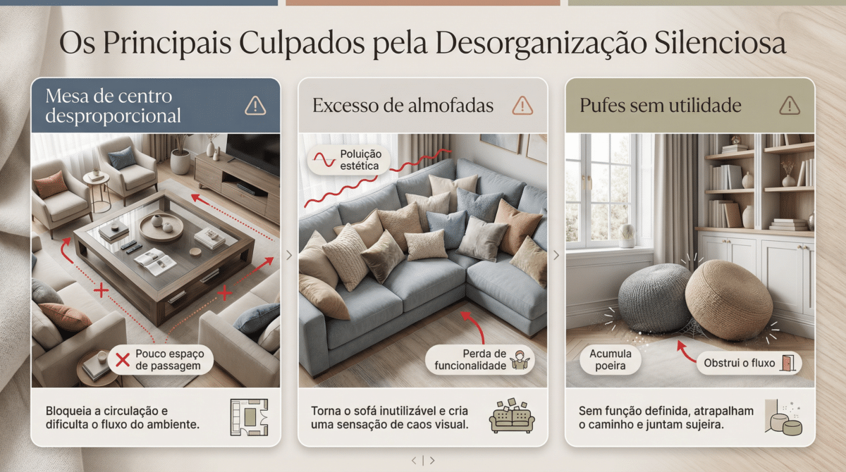 - Pufes sem utilidade: Itens que ficam parados em cantos apenas acumulando poeira e bloqueando o caminho.