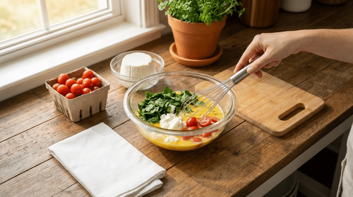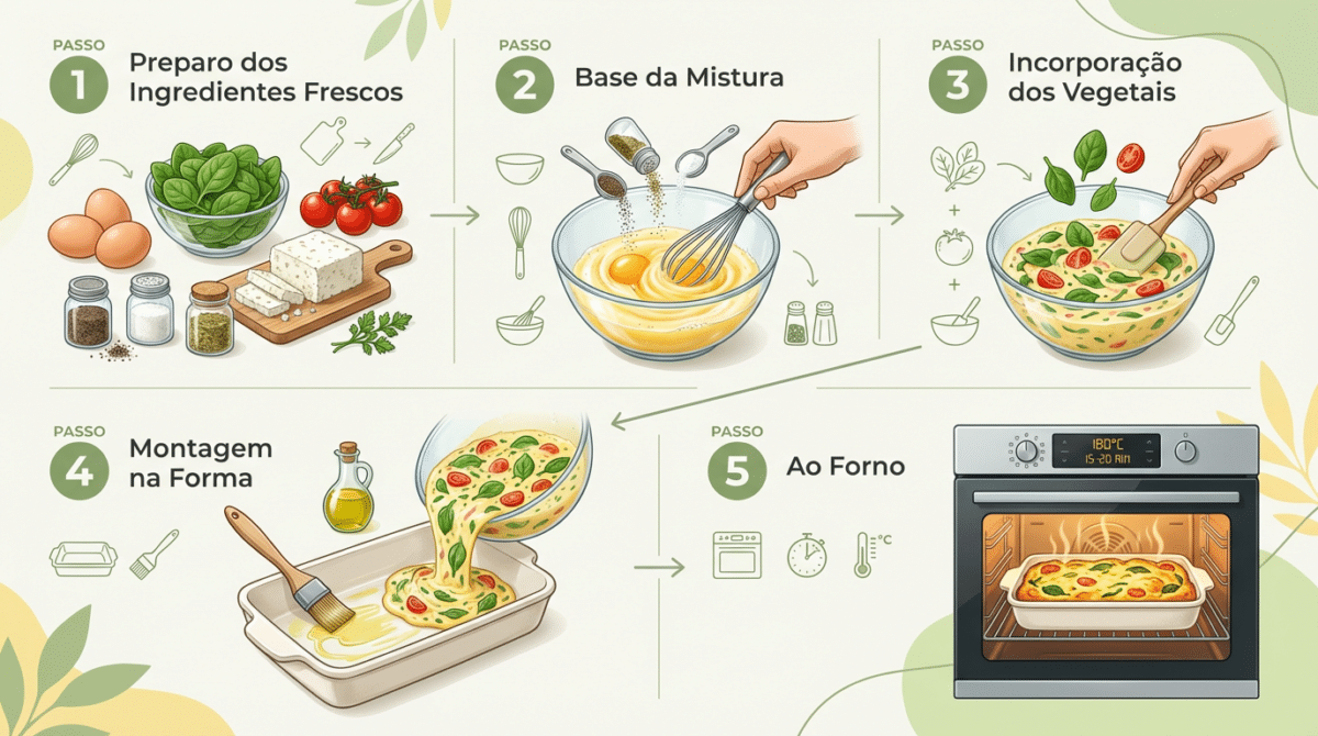 O preparo é extremamente simples e rápido, ideal para manhãs ocupadas. Comece por bater os ovos com os temperos e o fermento até obter uma mistura homogénea. Adicione os espinafres e o queijo. Unte um pequeno refratário com um fio de azeite e despeje a mistura. Leve ao forno pré-aquecido a 180°C por cerca de 15 a 20 minutos, ou até que a superfície esteja dourada e firme ao toque.