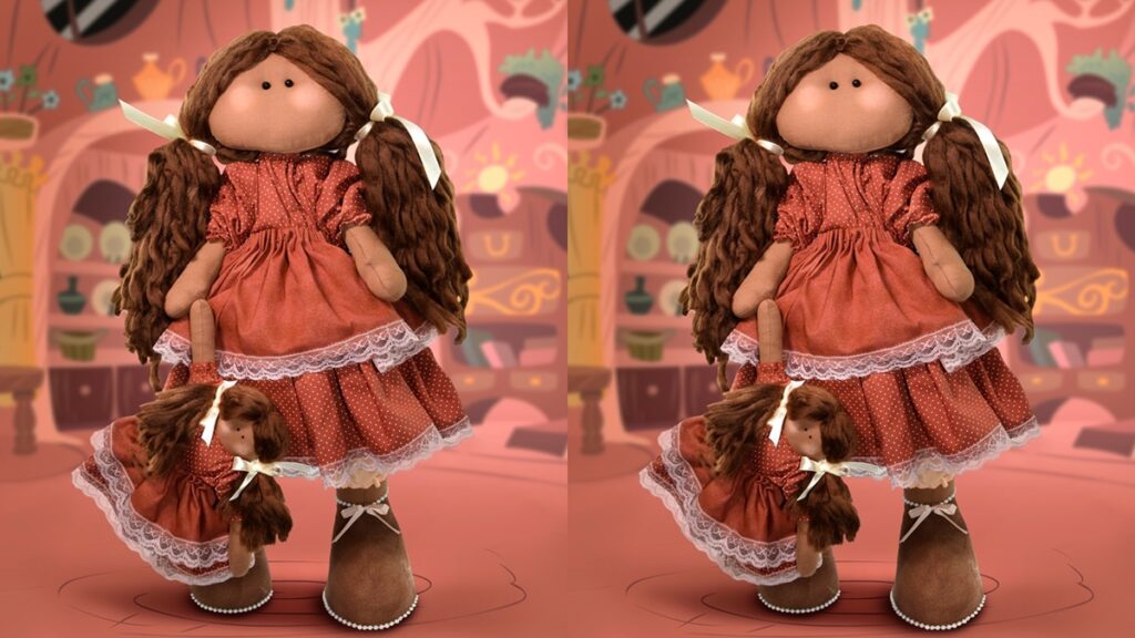 - Finalize os detalhes da bonequinha seguindo o mesmo processo em escala reduzida, garantindo que complemente a boneca maior.