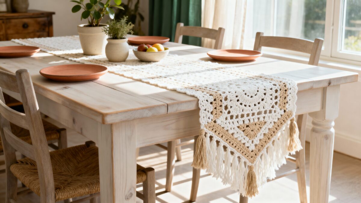 Há uma peça que tem aparecido cada vez mais nas casas com decoração acolhedora e sofisticada: o caminho de mesa em crochê.