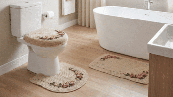 - Jogo de banheiro em crochê com um tapete extra para a porta.