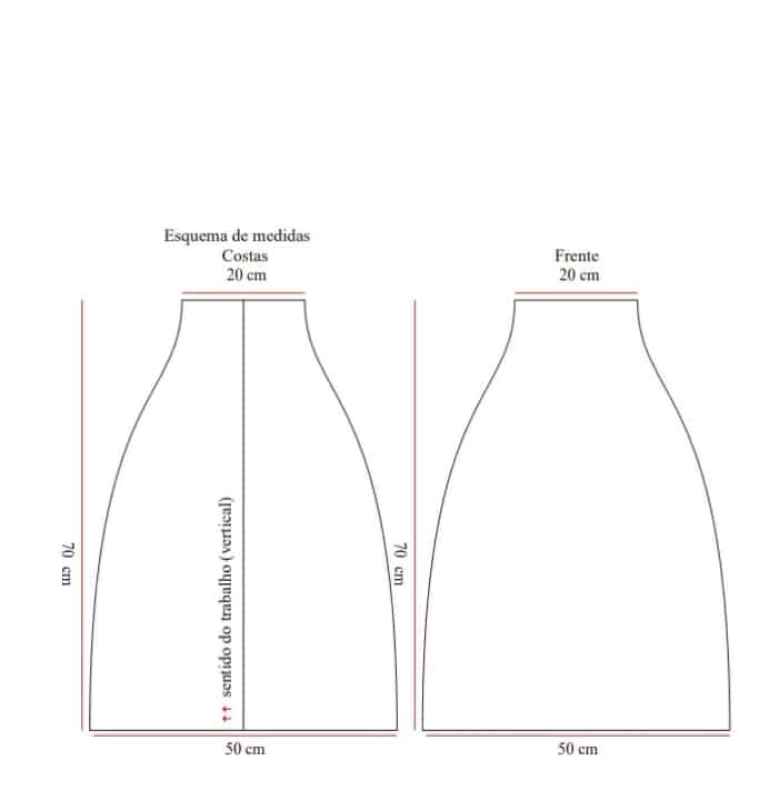Transfira os moldes para o papel vegetal para usar como referência na execução da peça. Observe as setas no esquema de medidas com a indicação do sentido do trabalho.