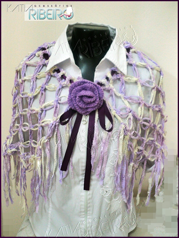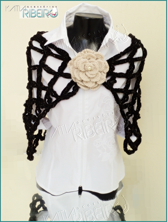 Pelerine confeccionada em croche com fio que apresenta textura de veludo e toques de fios metalizados ( prateado ou dourado). Esta peça é ideal para o inverno ou mesmo, pelo seu efeito vazado, para as noites mais frescas de verão , é também uma peça bastante versátil adicionando “glamour” a vestidos e blusas. Poderá ser executada nas cores clássicas : preto, marrom, cinza e branco (sujeito a disponibilidade do fornecedor). A flor broche acompanha o produto.