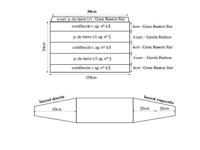 – na ag. monte 160 p. com a Cisne Passion e trab. igual a 1ª parte formando as listras com a Cisne Passion e a Cisne Acalanto, inicie na 11ª carr. arrematando na lateral direita a cada 2 carr. 36 vezes 1 p. e simultaneamente arremate na lateral esquerda a cada 6 carr. 8 vezes 5 p. e a 38cm desde o início arremate os 48 p. restantes de uma só vez. Montagem e acabamento: