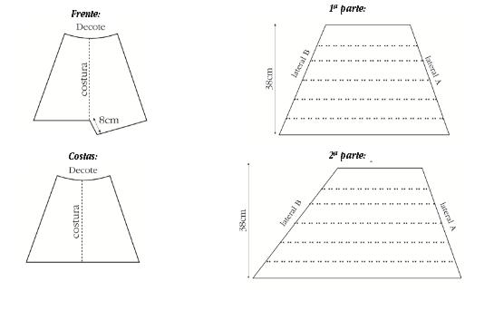 – na ag. monte 20 p. e trab. no p. fantasia. Para formar a manga aumente nos 2 lados a cada 2 carr. 8vezes 1 p. e trab. os p. aumentados em m.. A 98cm desde o início para a formação da 2ª manga, arremate os p. domesmo modo que foram aumentados. A 130cm desde o início arremate todos os p. de uma só vez. Una 20cm nas2 laterais para a formação das mangas.