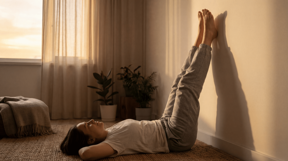 Elevar as pernas contra a parede é uma prática de inversão suave que atua diretamente no retorno venoso e no sistema linfático, promovendo um “reset” completo no corpo e na mente.