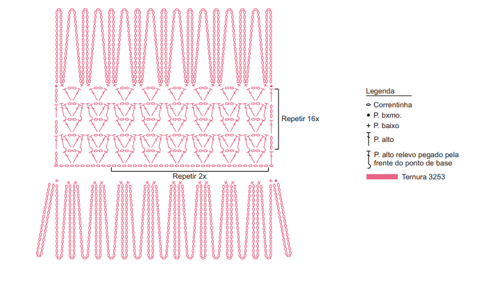 Abreviações e pontos utilizados: carr.: carreira, corr.: correntinha, p.: ponto, p. bxmo.: ponto baixíssimo, p. baixo: ponto baixo, p. alto: ponto alto.