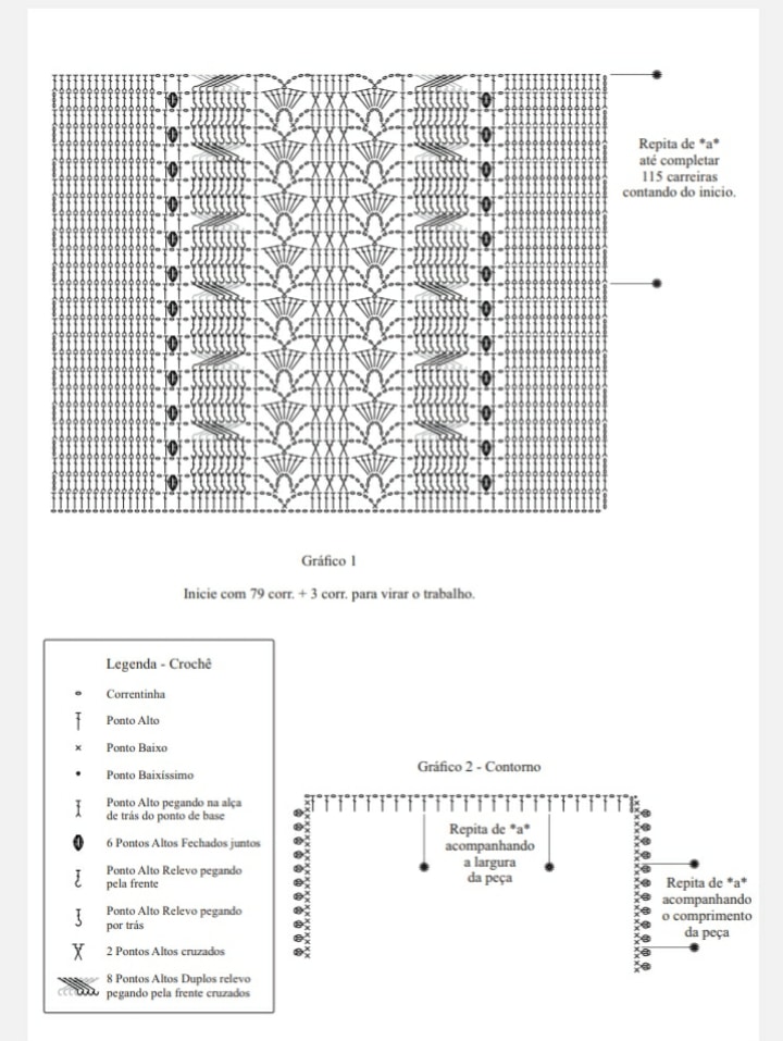 Pontos Utilizados no Crochê: corr. (Correntinha); p.b.x. (P Baixíssimo); p.a. (Pont Alto); p.b. (P. Baixo), p.a.r.t. (P. alto relevo pegando por trás), p.a.r.f. (Ponto altos relevo pegando pela frente), p.a.c. (Ponto alto cruzado).
