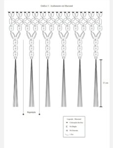 Então, prenda os fios com nó de colocação nos espaços e trab. com nó duplo, então, finalize com 1 nó de gravata, acomp. gráfico 3. Então, apare as pontas deixando as franjas com aproximadamente 13 cm.