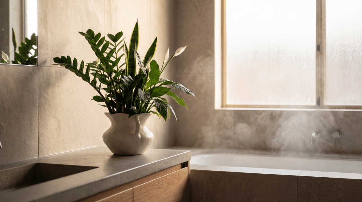 Extremamente resistente, a zamioculca tolera sombra total e períodos longos sem água. A umidade do banheiro mantém suas folhas brilhantes e firmes, mesmo quando o ambiente não recebe luz.