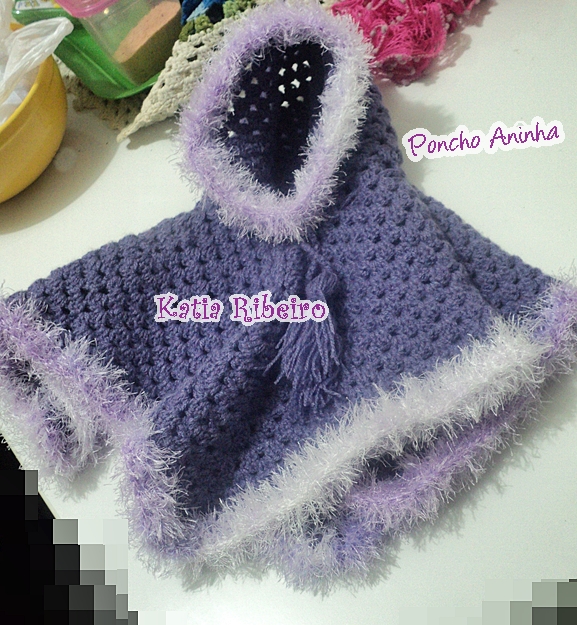 Vou mostrar para vocês um poncho infantil que fiz para a Ana Beatriz,ela tem 2 anos e meio e é minha priminha em 3º grau, puxaaa rs rs rs rs , não costumo fazer peças infantis mais minha prima lançou o desafio e eu aceitei com todo o amor, fiz seguindo as dicas da nossa talentosissíma e querida artesã Sonia Maria, acrescentei o capuz e o fio felpudo nas pontas que deu um charminho à parte, recebí vários elogios pela peça e fiquei feliz , é uma realização para nós não é mesmo amigas?