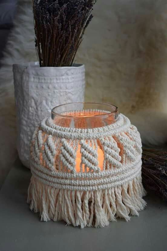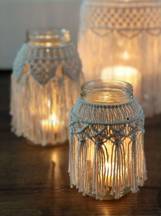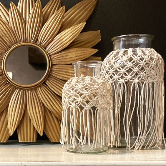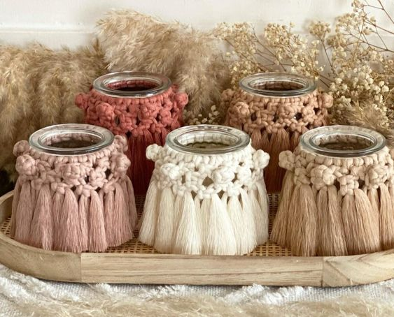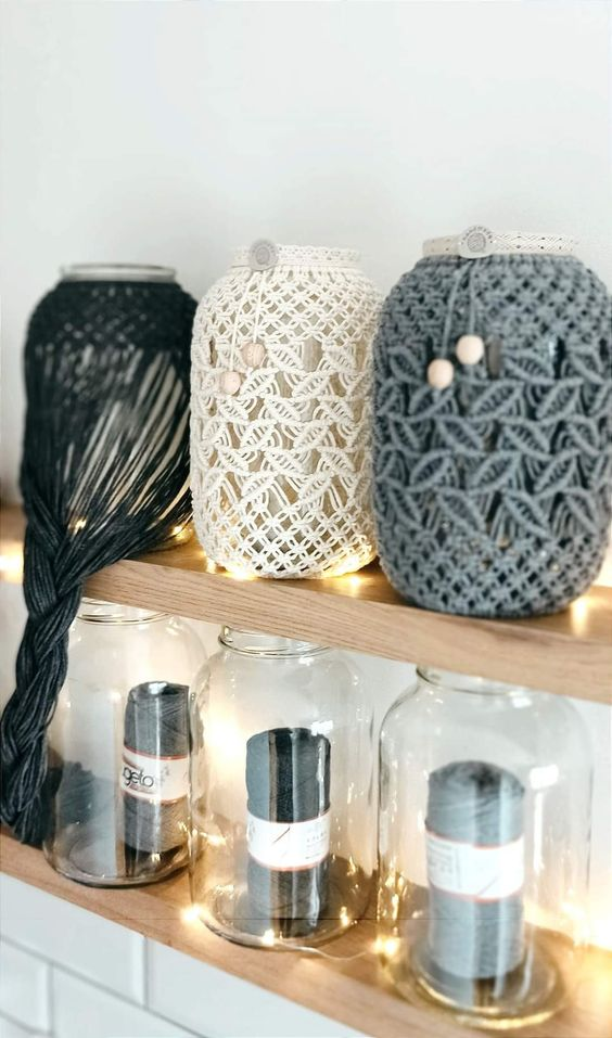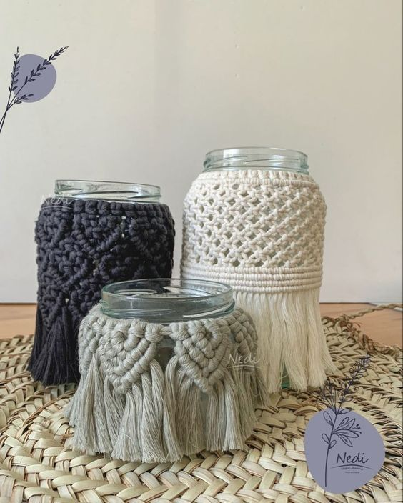 Transforme potes comuns em peças de destaque com capas de macramê. Essas capas podem ser feitas para envolver o pote completamente ou apenas parcialmente, criando um efeito decorativo delicado. Escolha fios em cores que complementem a paleta do seu ambiente e crie padrões de nós que adicionem textura e interesse. Essas capas são ideais para decorar potes de armazenamento na cozinha, banheiro ou sala de estar.