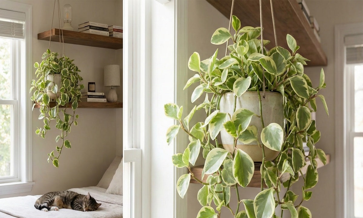 É a rainha da resistência. Se você está começando agora, esta é a sua planta segura. Suas folhas em formato de coração crescem em cascata e podem atingir metros de comprimento se não forem podadas.