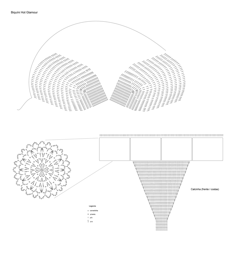Bojo direito – Inicie a peça com um 15 corr.. Acompanhando o diagrama correspondente da 1ª até a 6ª carr., trabalhe 3 corr. e 14 p.a. em carr. de ida e volta. A 7ª carr. contorna duas laterais do quadrado com 34 p.a. no total. Da 8ª até a 20ª carr., continue tecendo p.a. conforme o gráfico. No topo, suba uma alça de corr. com 96cm, que depois passará através da lateral do bojo esquerdo para então ser amarrada atrás das costas. Bojo esquerdo – Semelhante ao direito. Siga o diagrama correspondente. A alça no topo do bojo esquerdo deve passar pela lateral do bojo direito. Calcinha – Inicie a frente com 10 corr. e faça p.a. na 1ª carr. conforme o diagrama correspondente. Da 4ª carr. até a 22ª carr. suba com p.a. fazendo aumentos laterais. Arremate. Para o cós, faça 4 motivos observando o detalhe no gráfico e siga novamente para tecer as costas da calcinha. Faça a união dos motivos e contorne o cós e as pernas com p.b., aproveitando para fixar o elástico dentro dos pontos. Acabamento – Com a agulha de costura, fixe os bojos e faça a união do direito com o esquerdo. Costure o forro. Artesã – Bruna Szpisjak (1894)