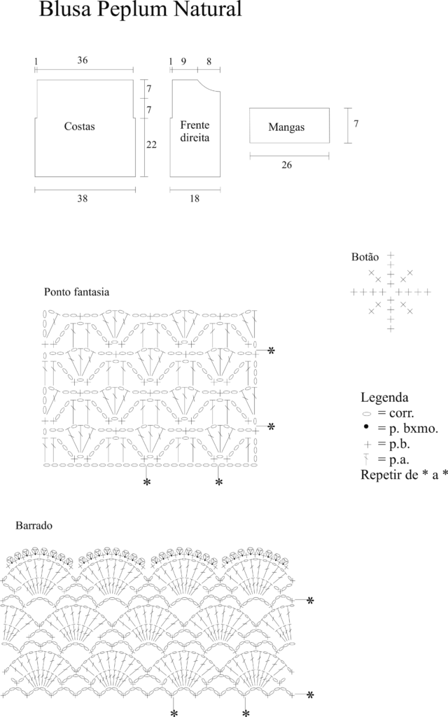 Pontos utilizados: Correntinha (corr.). Ponto baixíssimo (p. bxmo.): Introduza a ag., laç., puxe o p. e passe diretamente no p. da ag.. Ponto baixo (p. b.): introduza a ag. laç., puxe o p. e com outra laç., rem. todos os p.. Ponto alto (p. a.): laç., introduza a ag., laç., puxe o p. laç., rem., 2 p. e com outra laç., rem. todos os p.. Ponto fantasia: siga o gráfico. Barrado: siga o gráfico. Botão: siga o gráfico. Amostra: Um quadrado de 10 cm em p. fantasia com a ag. nº 1,75mm = 24 p. x 12 carr. Execução: Costas – Faça uma corr. de 90 p. mais 3 corr. para virar e trambalhe em p. fantasia seguindo o gráfico, repita de * a * no sentido dos p. (9 v.). A 22 cm do início do trabalho para as cavas deixe de fazer de cada lado 3 p. A 36 cm do início do trabalho rem.. Frente direita – Faça uma corr. de 50 p. mais 3 corr. para virar e trabalhe do seguinte modo: 6 p. em p. a. e 45 p. em p. fantasia seguindo o gráfico, repita de * a * no sentido dos p. (5 v.). Nos 6 p. em p. a. distribua 4 casas (trabalhe 2 p. a., faça 2 corr., pule 2 p. a. da carr. anterior, faça os 2 últimos p. a., na carr. seguinte trabalhe os 6 p. a.), faça a 1ª casa na 3ª carr. as outras com intervalos de 5 cm entre elas. A 22 cm do início do trabalho para a cava deixe de fazer à esquerda 3 p.. A 29 cm do início do trabalho para o decote deixe de fazer à direita em cada carr.: 6 p., 5 p., 4 p., 3 p. e 2 p.. A 36 cm do início do trabalho rem.. Frente esquerda – Mesmo trabalho da frente direita ao contrário e sem as casas. Acabamento – Costure os ombros. Para as mangas trabalhe em círculo a toda volta das cavas, o barrado seguindo o gráfico, repita de * a * no sentido dos p. (6 v.). Terminado o gráfico rem.. Trabalhe ao longo do decote as 4 últimas carr. do barrado seguindo o gráfico e rem.. Sobreponha os p. a. da frente direita aos p. a. da frente esquerda e trabalhe em círculo a toda volta da parte inferior da blusa, o barrado seguindo o gráfico, repita de * a * no sentido dos p. (20 v.). Nos p. sobrepostos trabalhe pegando as duas espessuras juntas. A 17 cm do início do barrado faça a última carr. do gráfico e rem.. Trabalhe o gráfico do botão seguindo o gráfico, entes de fechar, deixe dentro uma conta. Faça o mesmo trabalho com todas as contas. Pregue 5 botões na abertura da frente esquerda na mesma direção das casas da frente direita. O botão próximo ao decote é abotoado entre os p. do acabamento do decote. Faça um cordão de aproximadamente 150 cm de comprimento, enrolando 3 fios juntos. Passe este cordão entre os p. que separam o barrado do ponto fantasia. Prenda 2 botões em cada ponta do cordão.