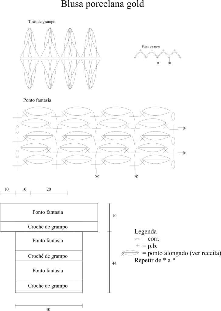 Pontos utilizados: Correntinha (corr.). Ponto baixo (p. b.): introduza a ag. laç., puxe o p. e com outra laç., rem. todos os p.. Ponto alongado: alongue o p. da ag. (mais ou menos 1 cm), laç., puxe o p., introduza a ag., entre o fio da esquerda e os dois fios da direita (do p. alongado), laç., puxe o p., laç., rem. os 2 p. da ag.. Ponto de arcos: siga o gráfico. Crochê de grampo: siga as instruções da agulha de grampo. União das alças: siga o gráfico correspondente. Ponto fantasia: siga o gráfico. Esquema de montagem: siga o molde. Amostra: Um quadrado de 10 cm em p. fantasia seguindo o gráfico com a ag. de crochê nº 3 = 12 p. x 20 carr.. Execução: Frente e costas – São iguais e trabalhadas juntas. Comece pelas tiras de grampo. Faça na regulagem 6 da ag. de grampo, 2 tiras com 120 alças de cada lado dos p. b. centrais e deixe à espera. Faça outras duas tiras com 168 alças de cada lado dos p. b. centrais, feche em círculo cada tira separadamente e deixe à espera. Trabalhe em círculo e em p. fantasia seguindo o gráfico em um dos lados de uma das tiras fechada círculo, faça um p. b. em cada 3 alças (ver tiras de grampo). A 10 cm do início em p. fantasia prenda a outra tira fechada em círculo. Trabalhe em círculo mais 10 cm em p. fantasia nas outras alças de uma das tiras e prenda uma das tiras com 120 alças, deixe 24 alças de cada lado, para as mangas. Trabalhe em carr. de ida e volta e em p. fantasia seguindo o gráfico no outro lado da tira com 120 alças. A 10 cm do início em p. fantasia rem.. Faça o mesmo trabalho com a outra tira de 120 alças. Acabamento – Faça em 20 cm de cada borda, uma carr. em p. de arcos seguindo o gráfico, para fechar os ombros. Feche a parte de baixo da manga com uma carr. em p. de arcos seguindo o gráfico da tira de grampo. Faça a toda volta da parte inferior da blusa 3 carr. em p. fantasia seguindo o gráfico e rem.. Artesã: Ateliê Círculo