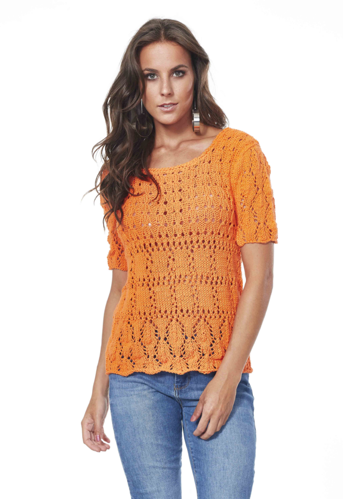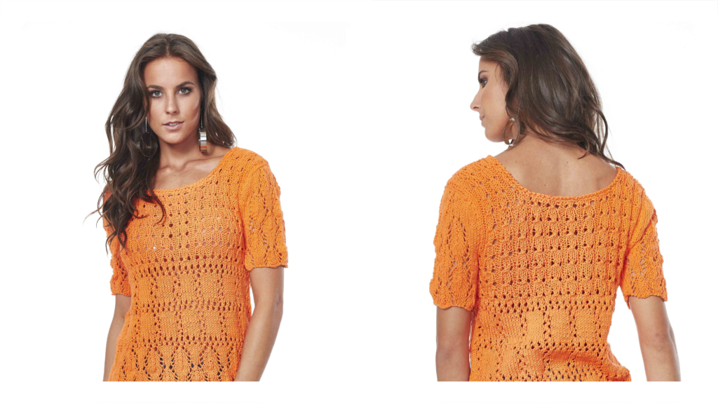 Costure os ombros. Monte as mangas. Costure os lados e as mangas. Faça a toda volta do decote uma carr. em p. caranguejo e rem..