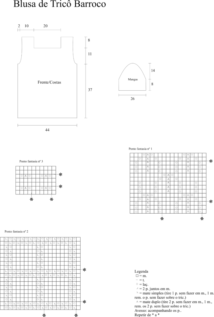 São iguais. Monte 72 p. nas ag. nº 4,5 e tric. em p. fantasia nº 1 seguindo o gráfico. Terminado o gráfico tric. em p. fantasia nº 2 seguindo o gráfico. Terminado o gráfico tric. em p. fantasia nº 3 seguindo o gráfico, repita de * a * no sentido das carr. até o final da peça. A 37 cm do início do trabalho para as cavas rem. de cada lado cada 2 carr.: 2 p. e 1 p.. A 48 cm do início do trabalho para o decote rem. os 32 p. centrais e termine cada lado separadamente. A 56 cm do início do trabalho rem..