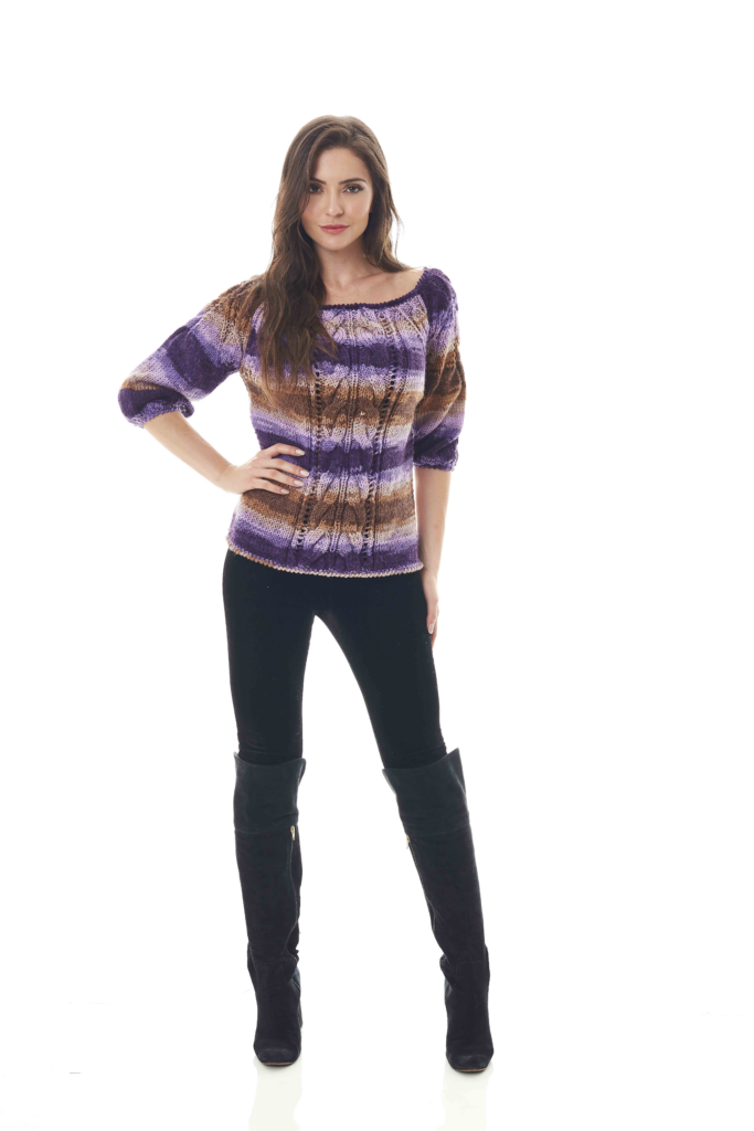 Pontos utilizados Ponto meia: direito em m., avesso em t.. Avesso do ponto meia: direito em t., avesso em m.. Ponto fantasia/mangas: siga o gráfico. Ponto fantasia/frente e costas: siga o gráfico. Correntinha (corr.). Ponto baixo (p. b.): introduza a ag. laç., puxe o p. e com outra laç., rem. todos os p.. Ponto caranguejo: trabalhe em p. b. da esquerda para direita. Amostra – Um quadrado de 10 cm em p. meia nas ag. nº 6mm = 16 p. x 19 carr.. Execução – Frente e costas – São iguais. Monte 79 p. nas ag. nº 6 e tric. em p. fantasia seguindo o gráfico. Repita de * a * até completas 34 cm e continue seguindo o gráfico para fazer as cavas. Terminado o gráfico rem.. Mangas – Monte 64 p. nas ag. nº 6 e tric. em p. meia. A 26 cm do início do trabalho tric. em p. fantasia seguindo o gráfico. Terminado o gráfico rem.. Acabamento – Costure as cavas. Costure os lados e as magas. Faça a toda volta do decote parte inferior da blusa, uma carr. em p. caranguejo. Faça a toda volta dos punhos uma carr. em p. caranguejo ajustando os p. para ficar com 18 cm de diâmetro. Artesã – Silvana da Costa (205477)