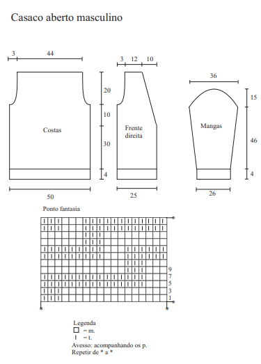 Pontos utilizados: Barra 1/1 – 1 m., 1 t.. Ponto meia – direito em m., avesso em t.. Ponto fantasia – siga o gráfico. Amostra: Um quadrado de 10 cm em p. meia com as ag. nº 6mm = 14 p. x 20 carr.. Execução: Costas – Monte 72 p. nas ag. nº 5,5 e tric. em barra 1/1. A 4 cm do início do trabalho passe para as ag. nº 6 e tric. em p. fantasia seguindo o gráfico. A 44 cm do início do trabalho para as cavas rem. de cada lado cada 2 carr.: 2 p. e 1 p. (3 v.). A 64 cm do início do trabalho rem.. Frente direita – Monte 36 p. nas ag. nº 5,5 e tric. em barra 1/1. A 4 cm do início do trabalho passe para as ag. nº 6 e tric. em p. fantasia seguindo o gráfico. A 34 cm do início do trabalho para o decote rem. à direita cada 4 carr.: 1 p. (14 v.). Ao mesmo tempo a 44 cm do início do trabalho rem. à esquerda a cava como nas costas. A 64 cm do início do trabalho rem.. Frente esquerda – Mesmo trabalho da frente direita ao contrário. Mangas – Monte 36 p. nas ag. nº 5,5mm e tric. em barra 1/1. A 4 cm do início do trabalho passe para as ag. nº 6mm e tric. em p. fantasia seguindo o gráfico. Aum. de cada lado cada 10 carr.: 1 p. (8 v.). A 50 cm do início do trabalho para a cava rem. de cada lado cada 2 carr.: 2 p. (6 v.) e 1 p. (8 v.) e os p. restantes. Bolso – Monte 24 p. nas ag. nº 5,5mm e tric. em p. meia. A 11 cm do início do trabalho tric. em barra 1/1. A 15 cm do início do trabalho rem.. Faça 2 bolsos iguais. Acabamento – Costure os ombros. Levante 200 p. ao longo das frentes e decote costas com a ag. circular e tric. em barra 1/1. A 2 cm do início dos p. levantados faça no lado da frente esquerda 4 casas (2 p. juntos em m., 1 laç.), a 1ª a 6 p. da borda as outra com 9 cm entre elas. A 4 cm do início dos p. levantados rem.. Costure os bolsos na frente, a 10 cm da abertura e a 10 cm da parte inferior. Monte as mangas. Costure os lados e as mangas. Pregue os botões no acabamento da frente direita na mesma direção das casas do acabamento da frente esquerda. Ateliê Círculo