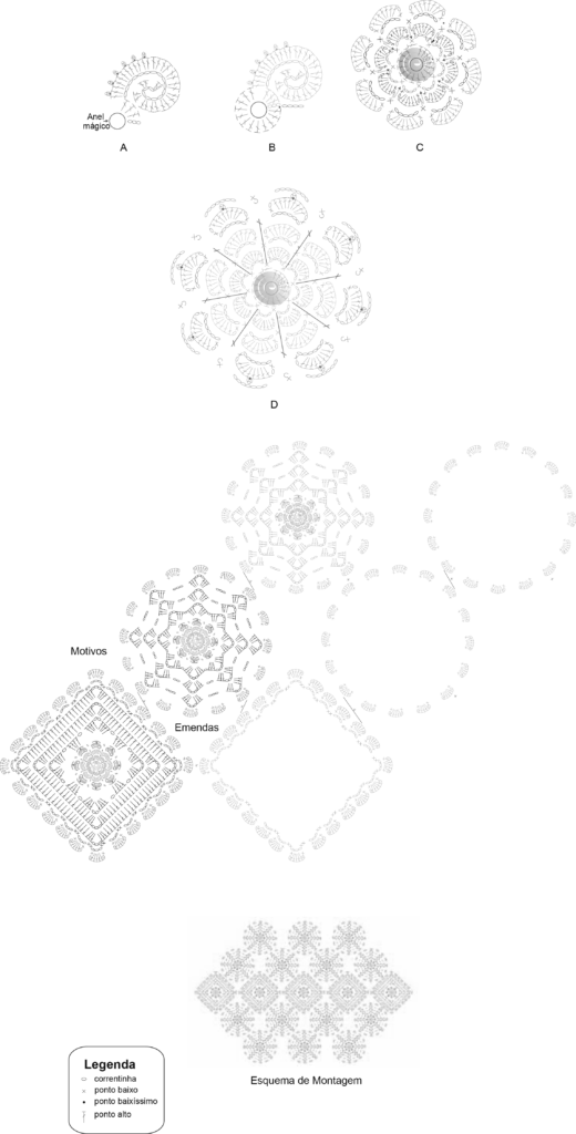 Tamanho: 160 X 95 cm Pontos usados: correntinha (corr); ponto baixo (p.b.); ponto baixíssimo (p.bxmo); ponto alto (p.a.). Execução: Com o Multicolor vermelho mescla faça o anel mágico, suba com 3 corr e trabalhe mais 3 p.a. dentro no anel. Faça 20 corr, 1 p.a. na 4ª corr a contar da agulha, 2 p.a. em cada das próximas 10 corr; nas 6 corr seguintes faça (1 p.a., 1 picô, 1 p.a.). Formou-se um rococó. Volte para o anel mágico e trabalhe mais 12 p.a.. Termine com 1 p.bxmo na 3ª corr inicial. 2ª carr: *4 corr, pule 1 p.a., 1 p.b. no p.a. seguinte*. Deixe que uma alça passe atrás do rococó. Repita até completar a volta. Corte e arremate o fio. 3ª carr: Com o Maxcolor branco trabalhe em cada alça: 1 p.b., 1 corr, 6 p.a., 1 corr, 1 p.b.. 4ª carr: Trabalhe com o direito voltado para si e atrás das pétalas: *1 p.b. no p.b. vermelho mescla, 5 corr*. Repita e no final da carr corte e arremate o fio. 5ª carr: Prenda o Maxcolor vermelho em qualquer alça e faça (1 p.b., 1 corr, 7 p.a., 1 corr, 1 p.b.). Repita em todas as alças, termine com p.bxmo no p.b. inicial, corte e arremate o fio. 6ª. carr: Prenda o Multicolor verde em qualquer p.b. da 4ª carr amarrando as duas camadas de pétalas e faça ali 1 p.b. alongado, *6 corr, 1 p.b. alongado no próximo p.b. da 4ª carr*. Repita. 7ª carr: Faça em cada alça (1 p.b., 1 corr, 8 p.a., 1 corr, 1 p.b.). Cole o rococó no miolo com a Cola Universal Círculo. Continue acompanhando o gráfico e o Esquema de Montagem. Artesã: Diandra Schmitt
