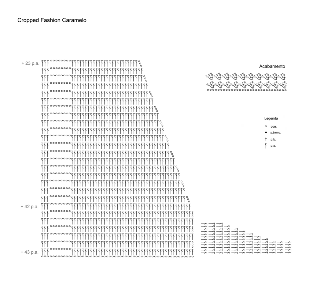 Pontos utilizados: corr.: correntinha, p.b.: ponto baixo, p.a.: ponto alto. Abreviaturas: p.: ponto, nov.: novelo, carr.: carreira, ag.: agulha, trab.: trabalhe, diag.: diagrama, rep.: repetição. Execução: Com o fio Fashion, inicie com 100 corr.. 1ª carr.: 3 corr. para subir, 45 p.a., pule 8 pontos de base, 8 corr., 46 p.a.. Da 2ª até a 6ª carr.: 3 corr. para subir, 45 p.a., pule 8 pontos de base, 8 corr., 46 p.a.. Na 7ª carr. faça 1 redução de cada lado: 3 corr. para subir, pule um ponto de base, 44 p.a., pule 8 pontos de base, 8 corr., 45 p.a.. Da 8ª até a 26ª carr.: reduza 1 p.a. de cada extremidade. Arremate. Em seguida, com o fio Charme, faça a lateral com p.a. conforme o diagrama até atingir 42cm. Repita para a outra lateral. Faça o acabamento contornando a peça: 1 p.b., 2 corr. e 2 p.a. a cada 3 pontos de base, seguindo o diagrama correspondente. Para a alça do pescoço, suba um cordão de corr. de 44cm para cada lado. Acabamento – Pendure pompons de fio acrílico no comprimento. Artesã – Ateliê Círculo (1446)