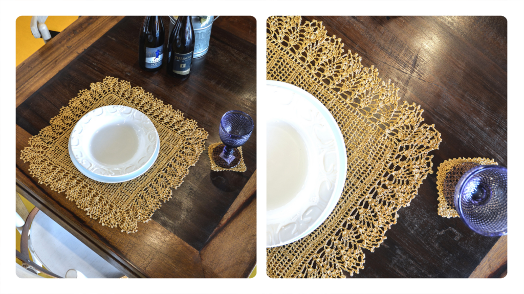 Nada se compara à beleza única de um jogo americano feito à mão. O fio dourado adiciona um toque de luxo e glamour à mesa, tornando qualquer refeição especial. Imagine um jantar festivo, onde cada detalhe foi pensado com cuidado. O jogo americano ouro não apenas complementa a decoração, mas também se torna o destaque da mesa. Além disso, o crochê permite personalizações infinitas, adaptando-se ao estilo e à personalidade do anfitrião.