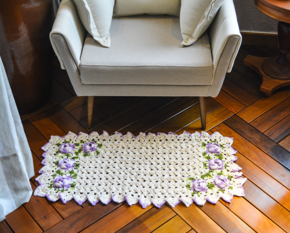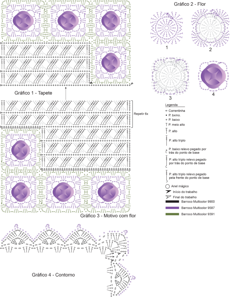 Tamanho: 103 x 52 cm. Execução: Tapete: com o fio na cor mescla de cru, fazer 40 correntinhas mais 1 corr. para virar e seguir o gráfico 1. Flor (8x): com o fio na cor mescla de roxo, fazer um anel mágico e seguir o gráfico 2 ou receita abaixo. 1ª carr.: fazer 3 corr., 15 p. altos dentro do anel, fechar todas as carr. com 1 p. bxmo. 2ª carr.: *1 p. baixo no p. de base, 3 corr., pular 1 p. de base* 8x. 3ª carr.: fazer p. bxmo. até o meio das 3 corr., *1 p. baixo nas 3 corr., 7 p. altos nas 3 corr. seguintes* 4x. 4ª carr.: *1 p. baixo em relevo pegando por trás do p. baixo da 2ª carr., 4 corr.* 8x. 5ª carr.: fazer p. bxmo. até o meio das 4 corr., *1 p. baixo nas 4 corr., 9 p. altos nas 4 corr. seguintes* 4x. 6ª carr.: *1 p. baixo em relevo pegando por trás do p. baixo em relevo da 4ª carr., 3 corr., 1 p. baixo em relevo pegando por trás do p. baixo em relevo da seguinte 4ª carr., 5 corr.* 4x. Motivo com flor: com o fio na cor roxa, seguir o gráfico 3 ao redor da flor. Observar a troca de cor do fio no gráfico. Unir os motivos com p. bxmo. entre si e no tapete, de acordo com o gráfico. Contorno: 3 carr. com o fio na cor mescla de cru e 1 carr. com o fio na cor mescla de roxo. Seguir o gráfico 4 ao redor do tapete.