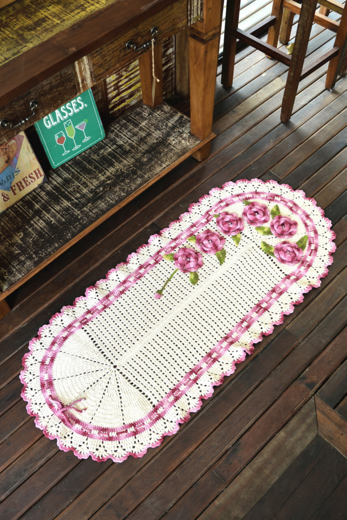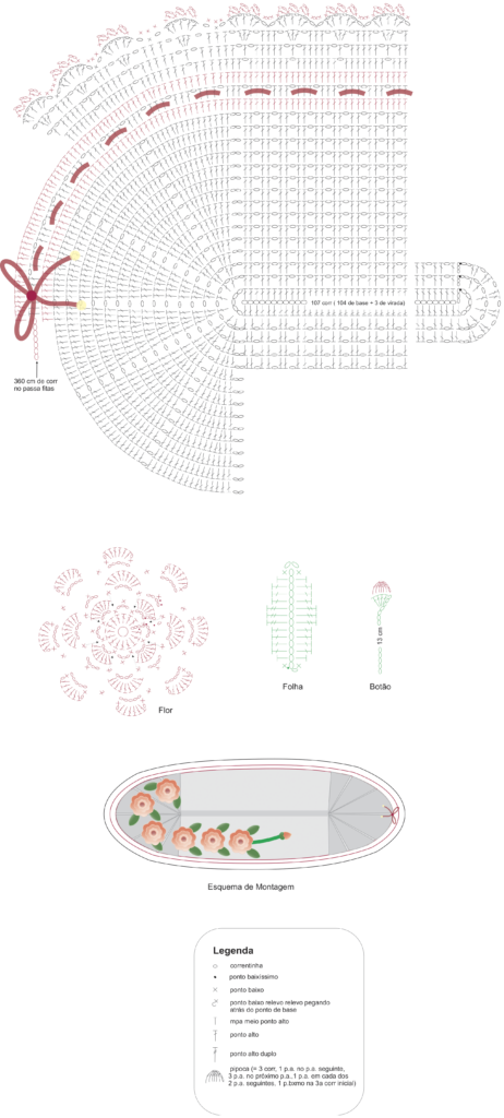Flores: Com o Multicolor rosa faça o anel mágico, suba com 3 corr e trabalhe dentro do anel 15 p.a.. Termine com p.bxmo na 3ª corr inicial. 2ª carr: 1 corr, 1 p.b. junto com o p.bxmo, *3 corr, pule 1 p.a., 1 p.b. no p.a. seguinte*. Repita de * a * e termine com p.bxmo no p.b. inicial. 3ª carr: Na alça seguinte faça (1 p.bxmo, 3 corr, 6 p.a.), *1 p.b. na próxima alça, na alça seguinte faça 7 p.a.*. Repita de * a * e termine com p.bxmo na 3ª corr inicial. 4ª carr: *1 p.b. relevo pegando atrás do próximo p.b. da 2ª carr, 4 corr*. Repita de * a *. 5ª carr: Trabalhe p.bxmo até metade da próxima alça e faça ali 1 p.b., *na alça seguinte trabalhe 9 p.a., 1 p.b. na próxima alça*. Repita de * a *. 6ª carr: *1 p.b. relevo pegando atrás do próximo p.b. relevo da 4ª carr, 5 corr*. Repita. 7ª carr: Trabalhe em cada alça (1 p.b., 1 corr, 6 p.a., 1 corr, 1 p.b.) e no final da carr corte e arremate o fio. Faça 6 flores iguais. Acompanhe o gráfico da Folha e do Botão. Trabalhe 11 folhas iguais e 1 botão. Acompanhe o Esquema de Montagem e use a Cola Universal Círculo para montar o ramo sobre o tapete. Trabalhe um cordão com 360 cm de corr e passe no passa fitas fazendo um lacinho no lado oposto ao ramo de flores.