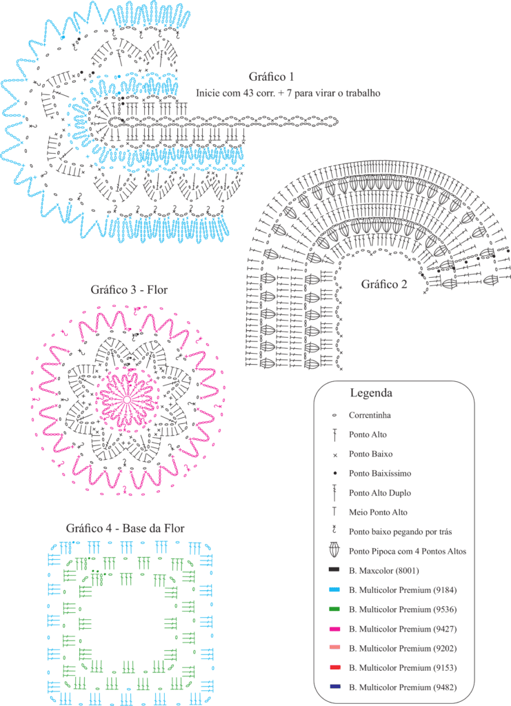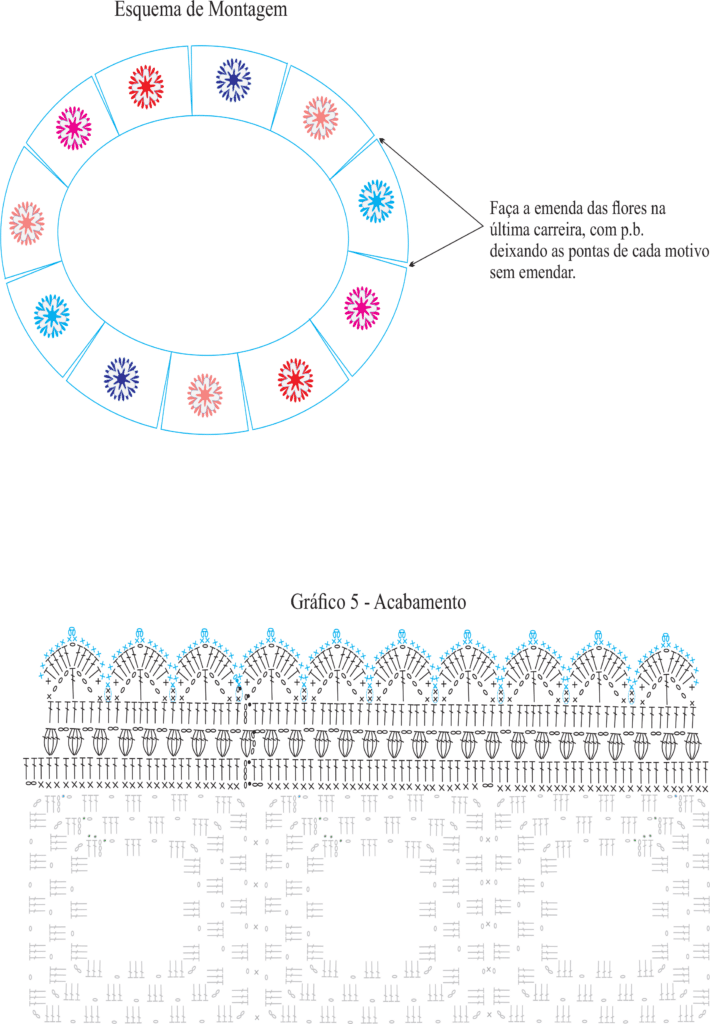 Abreviações: p.a. (Ponto Alto); p.b. (Ponto Baixo); corr. (Correntinha); p.b.x. (Ponto Baixíssimo); carr. (Carreira); p.b.r.t. (Ponto baixo em relevo pegando por trás); p.a.d. (Ponto Alto Duplo) Execução: Gráfico 1 Com o fio Branco, inicie com 43 + 7 corr. para virar o trabalho 1ª carr.: volte trabalhando na 8ª corr. a contar da agulha; *1 p.b. 3 corr. pule três corr. de base; * repita de *a* mais (12x) Feche com p.b.x. na corr. inicial. 2ª carr.: inicie com 3 corr. 9 p.a.; * 3 p.a. na próxima alça; * repita de *a* mais (11x); 10 p.a. na última alça; repita de *a* mais (12x). Feche com p.b.x. Continue conforme gráfico 1, trabalhando em carr. circulares e realizando as devidas trocas de cores. Feche com p.b.x. Arremate o fio. Gráfico 2 Emende o fio Branco, sobre o p.b.r.t.; da 8ª carr. do gráfico 1. 1ª carr.: inicie com 4 corr. *1 p.b. sobre o próximo p.b.r.t.; 3 corr. de espaço*; repita de *a* até o final da carr. Feche com p.b.x. 2ª carr.: inicie com 3 corr. 1 p.a. no mesmo ponto de base; *3 p.a.; 2 p.a. no mesmo ponto de base; * repita de *a* mais (4x) dando um total de 6 aumentos; trabalhe a lateral do tapete com 3 p.a. em cada alça; repita de *a* mais (6x); e trabalhe a lateral do tapete com 3 p.a. em cada alça. Feche com p.b.x. Continue conforme gráfico 2, trabalhando em carr. circulares. Feche com p.b.x. Arremate o fio. Gráfico 3- Flor (11x) Faça 11 Flores iguais, sendo 3 flores na cor Antúrio, 2 na cor Flor, 2 na cor Pacífico, 2 na cor Cabaré e 2 na cor Sereia. Com o fio mesclado, inicie com um anel mágico. 1ª carr.: inicie com 3 corr. 15 p.a. Feche com p.b.x. 2ª carr.: trabalhe pegando apenas na alça da frente do ponto de base; inicie com 5 corr. *1 p.b. 7 corr. 1 p.b. 4 corr.* repita de *a* até o final da carr. Feche com p.b.x. 3ª carr. trabalhe sobre a 1ª carr.; inicie com 1corr. * 1 p.b.r.t. 3 corr. pule um ponto de base; * repita de *a* mais (7x). Feche com p.b.x. Arremate o fio. 4ª carr. inicie com 1 corr. * 1 p.b. 3 corr. 1 p.a.d. 3 corr. 1 p.b.* repita de *a* mais (7x). Feche com p.b.x. Continue conforme gráfico 3, realizando as devidas trocas de cores. Feche com p.b.x. Gráfico 4 – Base da Flor (11x) Emende o fio Gramado, sobre uma das alças da flor. 1ª carr.: inicie com 3 corr. 2 p.a. 2 corr. 3 p.a.; *2 corr. de espaço; 3 p.a.; 2 corr. de espaço; 3 p.a. 2 corr. 3 p.a; * repita de *a* mais (2x). Feche com p.b.x. Continue conforme gráfico 4, realizando as devidas trocas de cores. Faça a emenda na última carr. com p.b. conforme esquema de montagem, deixando as pontas das bases sem fazer a emenda, conforme indicação no esquema de montagem. Feche com p.b.x. Arremate o fio. Faça 11 bases iguais. Gráfico 5 – Acabamento Emende o fio Branco, sobre a ponta de um dos motivos. 1ª carr.: inicie com 1 corr. 25 p.b.; * 2 corr. de espaço entre uma base e outra; 26 p.b. * repita de *a* mais (9x). Feche com p.b.x. 2ª carr.: inicie com 3 corr. trabalhe a carr. com 1 p.a. sobre cada ponto de base. Feche com p.b.x. Continue conforme gráfico 5, trabalhando em carr. circulares e realizando as devidas trocas de cor. Feche com p.b.x. Arremate o fio. Artesã: Mariane Machado