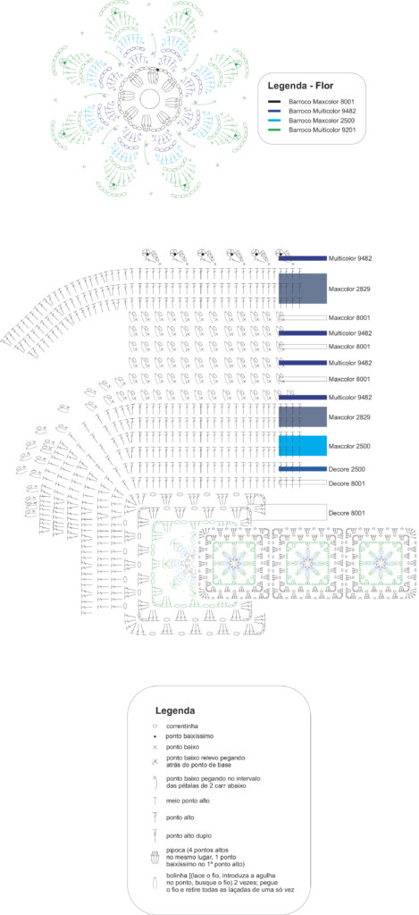 Pontos usados: correntinha (corr); ponto baixo (p.b.); ponto baixíssimo (p.bxmo); ponto baixo relevo pegando atrás do ponto de base; meio ponto alto (m.p.a.); ponto alto (p.a.); ponto alto duplo (p.a.d.); pipoca (4 p.a. no mesmo lugar; 1 p.bxmo no 1º p.a.); bolinha (lace o fio, introduza a agulha no ponto e busque o fio) 2 vezes; pegue o fio e retire todas as laçadas de uma só vez). Execução – Flor: Usando o Maxcolor branco faça o anel mágico, suba com 3 corr e trabalhe dentro do anel [3 p.a., forme 1 pipoca, 3 corr, (1 pipoca com 4 p.a., 3 corr) 7 vezes]. Termine com p.bxmo na 3ª corr inicial. Corte e arremate o fio. 2ª carr: Prenda o Multicolor azul em qualquer espaço e trabalhe ali (1 p.b., 1 m.p.a., 3 p.a., 1 m.p.a., 1 p.b.). Repita em todos os outros espaços e termine com p.bxmo no p.b. inicial. 3ª carr: *1 p.b. relevo pegando 1 fio de cada dos 2 p.b. atrás da camada de pétalas, 5 corr*. Repita de * a *, termine com p.bxmo no p.b. inicial, corte e arremate o fio. 4ª carr: Prenda o Maxcolor turquesa em qualquer alça e trabalhe ali (1 p.b., 1 m.p.a., 5 p.a., 1 m.p.a., 1 p.b.). Repita em todas as alças. Corte e arremate o fio. 5ª carr: Com o Multicolor verde entre com a agulha no intervalo de quaisquer pétalas da 1ª camada e faça 1 p.b. alongado envolvendo as 2 camadas de pétalas, 6 corr. Repita no intervalo de todas as pétalas. 6ª carr: Trabalhe em cada alça (1 p.b., 1 m.p.a., 1 p.a., 2 p.a.d., 1 picô, 2 p.a.d., 1 p.a., 1 m.p.a., 1 p.b.). 7ª carr: *1 p.b. relevo pegando atrás da p.b. alongado, 7 corr*. Repita em toda a volta, corte e arremate o fio. Faça 3 flores iguais, complete com o Decore branco formando o quadrado ao redor das flores – observe que 2 quadrados tem 2 cantos arredondados – junte os quadrados com p.b. e continue a peça conforme o gráfico. Artesã: Ateliê Círculo