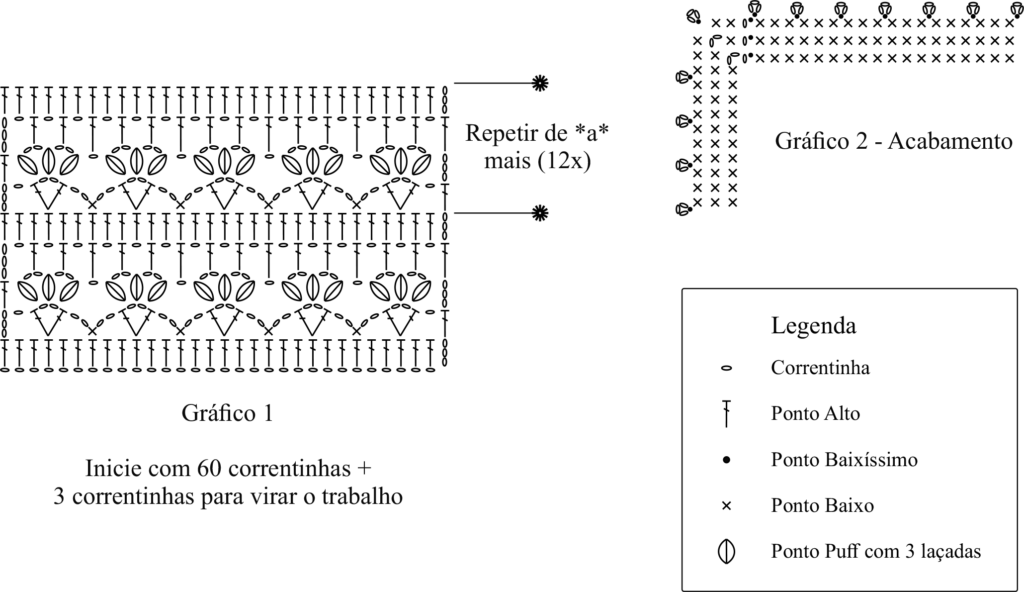Abreviações: p. (Ponto), pts. (pontos), trab. (trabalhe ou trabalhando), ag. (agulha), rep. (repetição ou repetições), rem. (rematar), acomp. (acompanhando), corr. (Correntinha), carr. (Carreira); laç. (Laçada); p.b. (Ponto Baixo), p.a. (Ponto Alto), p. puff (Ponto Puff com 3 laçadas)