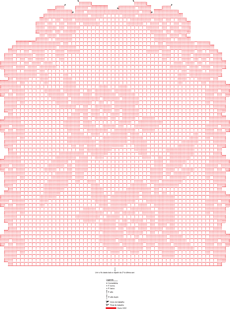 Com o fio na cor vermelha, fazer 16 correntinhas, fechar em círculo com 1 p. bxmo. e seguir o gráfico.