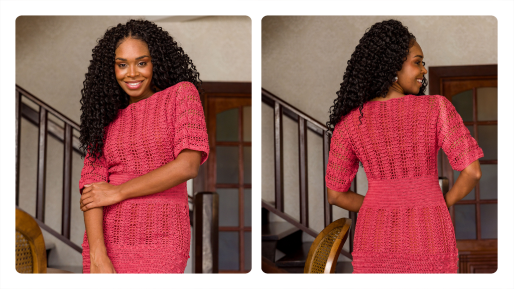 Costas: use a ag. de crochê de 3,0 mm e o fio Cléa Duplo (3270). Inicie a peça pela parte inferior, trab. um cordão de 101 corr. Sobre o cordão, trab. no p. fantasia (A) acomp. o diag. 1 e o p. de rep. da 1ª até a 15ª carr. Na carr. seg., prossiga no p. fantasia (B) acomp. o diag. 2 e os pts. de rep. da 16ª até a 32ª carr. Na carr. seg., prossiga no p. fantasia (C) acomp. o diag. 3 e o p. de rep. da 33ª até a 52ª carr. Na carr. seg., prossiga no p. fantasia (D) acomp. o diag. 4 da 53ª até a 79ª carr. Rem. o fio e reserve a peça. Frente: igual a parte das costas. Montagem e acabamentos: use a ag. de tapeçaria e o fio Cléa Duplo (3270). Feche os ombros e a parte superior da manga (33 cm), deixando a abertura do decote de 25 cm. Feche a parte inferior de cada manga (19 cm). Feche a lateral dir. do corpo (43 cm) deixando a abertura da cava de 19 cm. Prenda o zíper na lateral esq. do corpo na parte superior (18 cm), depois feche a parte inferior de 25 cm, deixando a abertura da cava de 19 cm. Borda da manga: use a ag. de crochê de 3,0 mm e o fio Cléa Duplo (3270). Uma o fio na borda da manga e trab. o bico de acabamento acomp. o diag. 5 e o p. de rep. da 80ª até a 82ª carr., rem. o fio. Faça a outra borda igual. Barra: use a ag. de crochê de 3,0 mm e o fio Cléa Duplo 3270 (Azevinho). Una o fio no cordão inicial da peça e trab. no p. fantasia (E) acomp. o diag. 6 e o p. de rep. da 83ª até a 93ª carr., rem. o fio. Sugestão do forro: vestido tubinho regata, peça avulsa.