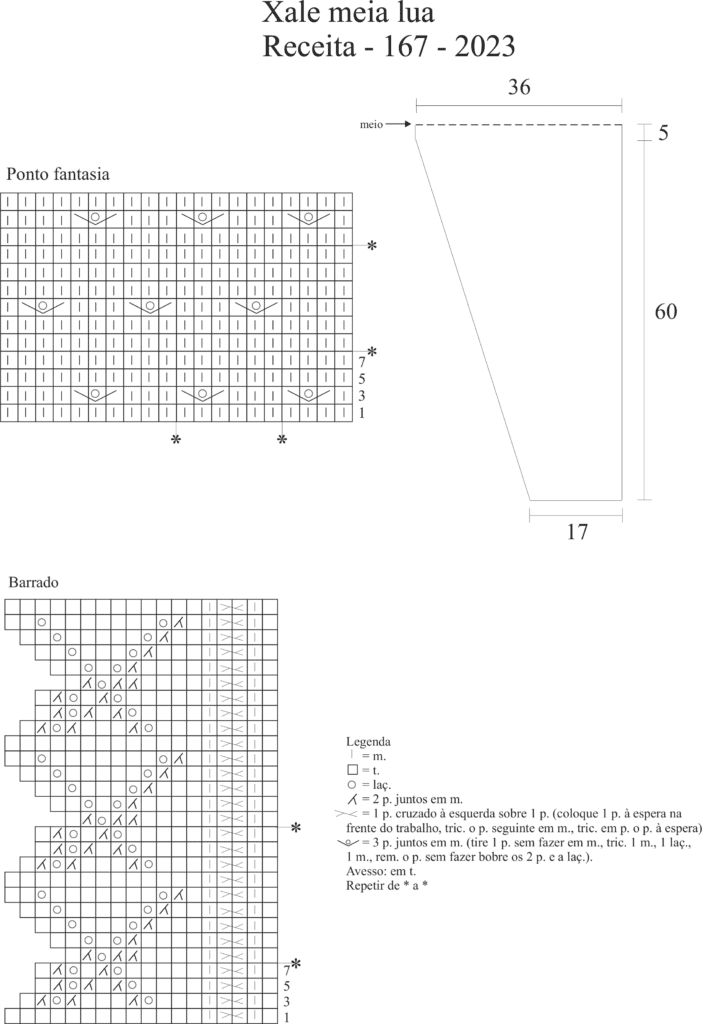 Xale: monte 29 p. nas ag. nº 5,5 mm e tric. do seguinte modo: 6 p. em p. de borda seguindo a receita, 6 p. em p. fantasia seguindo o gráfico e 13 p. em p. do barrado seguindo o gráfico. Aum. entre o p. fantasia e o barrado cada 4 carr.: 1 p. (34 v.). Terminado os aum. tric. 48 carr. retas em seguida dim. entre o p. fantasia e o barrado cara 4 carr.: 1 p. (34 v.). A 130 cm do início do trabalho rem.