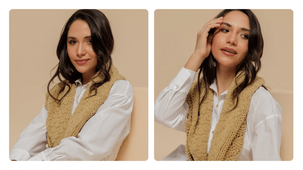 Para o xale de tricô Porcelana, opte por cores suaves e neutras como branco, creme ou tons pastel. Essas cores trazem uma sensação de delicadeza e combinam facilmente com diversas peças do seu guarda-roupa. Cores neutras também são ideais para ocasiões formais e especiais.