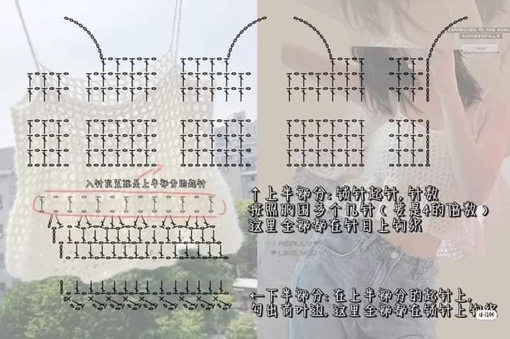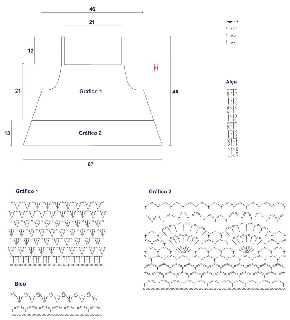 Após completar ambas as partes, é hora de adicionar os toques finais. Siga o diagrama para criar as alças e una a frente e as costas com agulha de costura, garantindo um acabamento impecável.