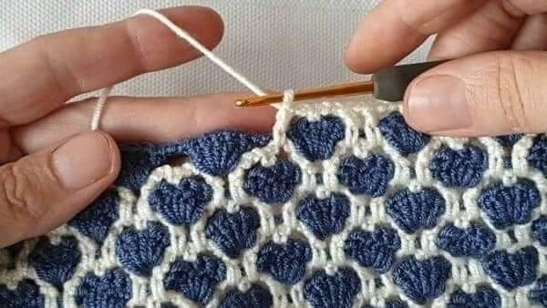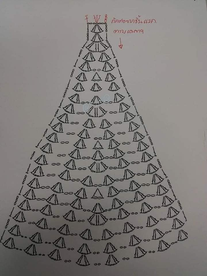 Na segunda carreira, continue fazendo 3 pontos altos e 1 correntinha em cada correntinha de base. Continue seguindo as instruções do gráfico até alcançar a altura desejada, que é aproximadamente 10cm.