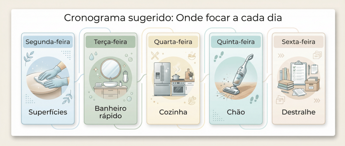 Para evitar a sobrecarga, divida a casa por zonas ou categorias. Veja um exemplo de fluxo rápido:
